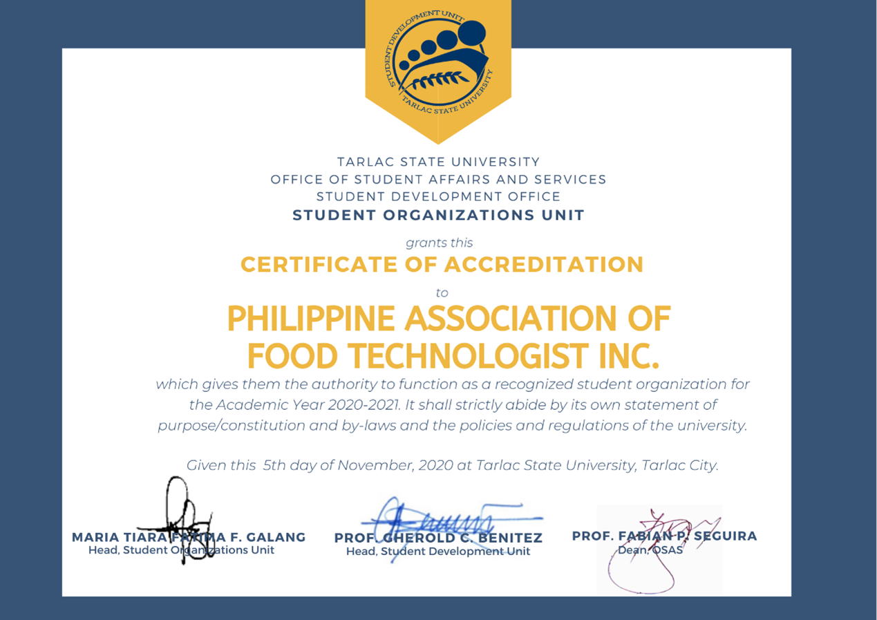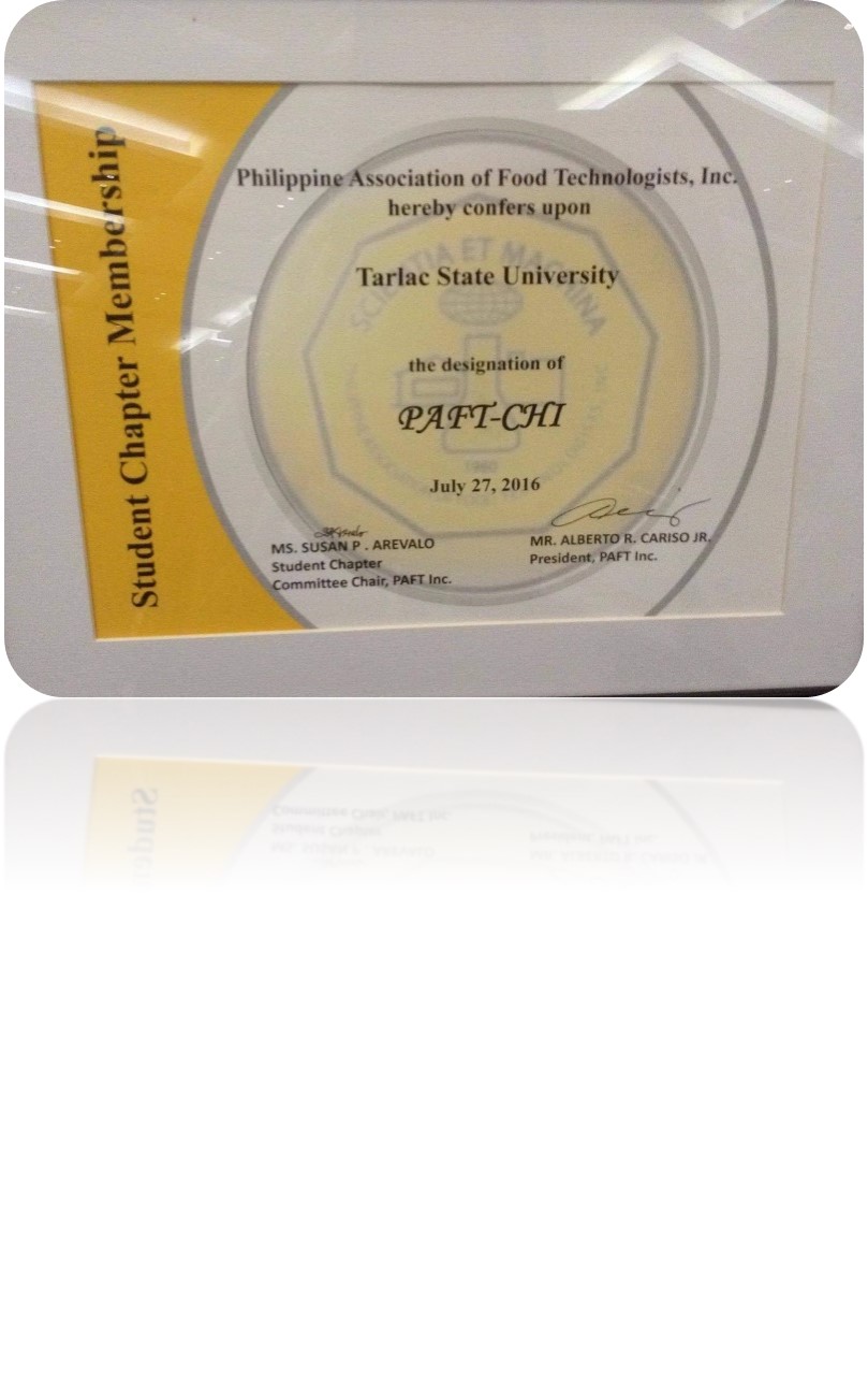 Certificate of Accreditation to PAFT-Chi recognized as Active Organization in Tarlac State University