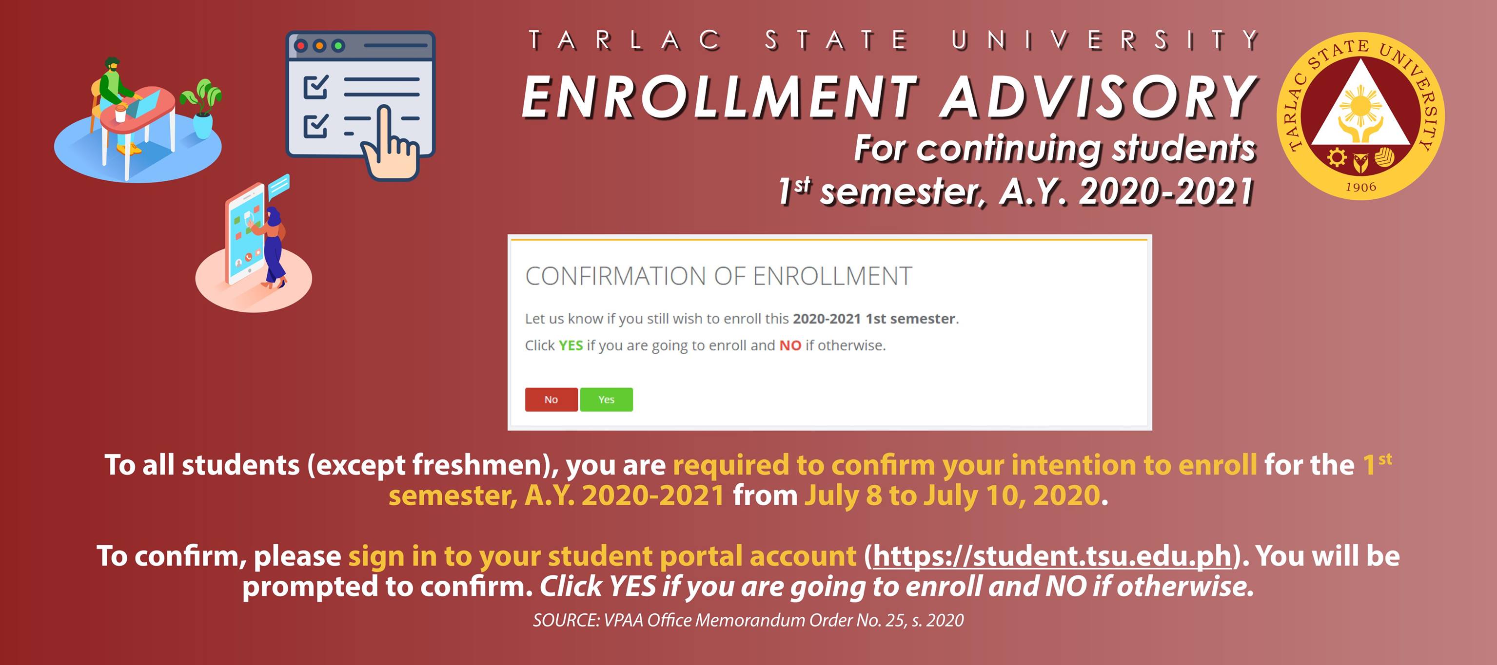 To all students (except freshmen), you are required to confirm your intention to enroll for the 1st semester, A.Y. 2020-2021 from July 8 to July 10, 2020.