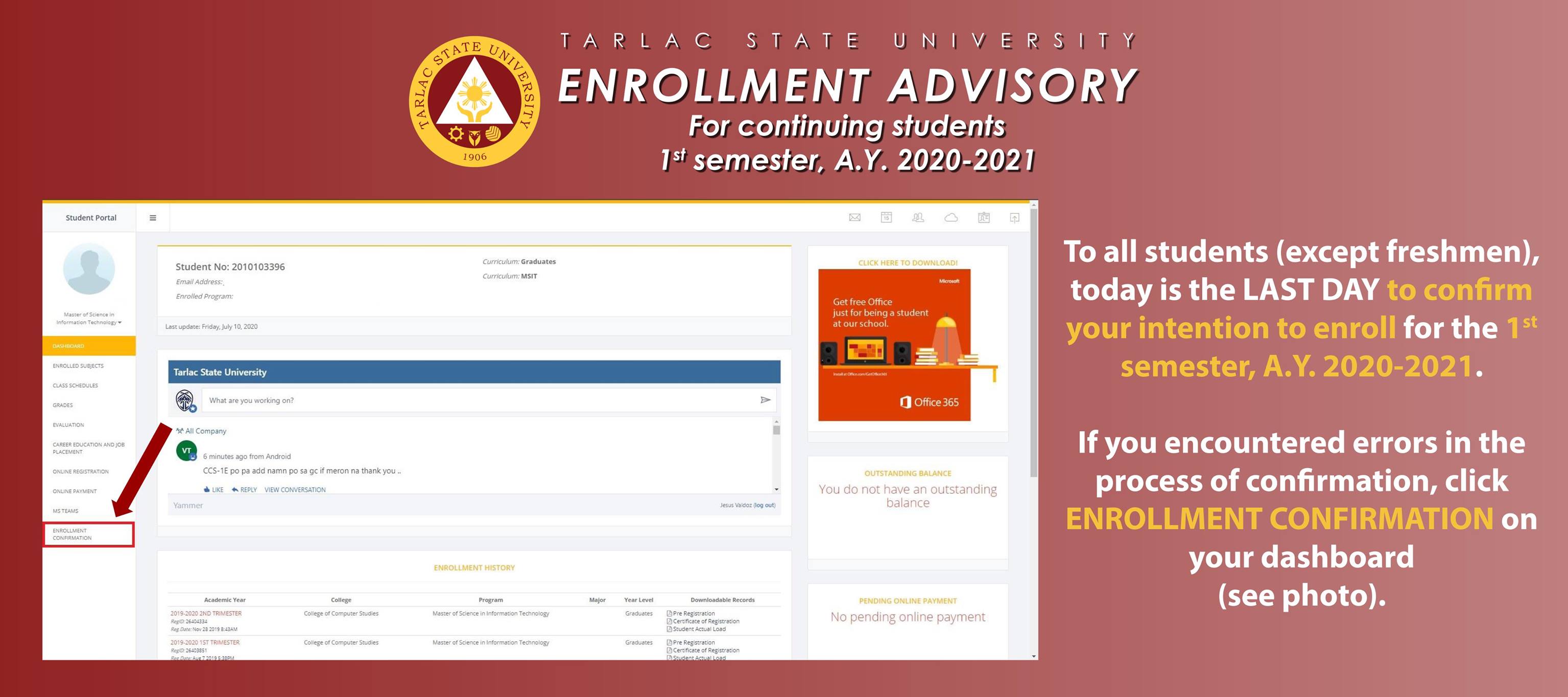 To all students (except freshmen), today is the LAST DAY to confirm your intention to enroll for the 1st semester, A.Y. 2020-2021.