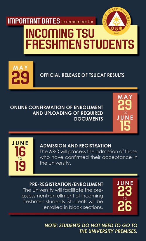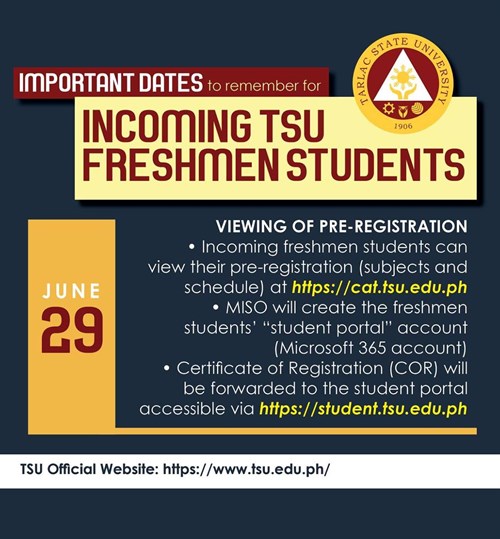 • Incoming freshmen students can view their pre-registration (subjects and schedule) at https://cat.tsu.edu.ph