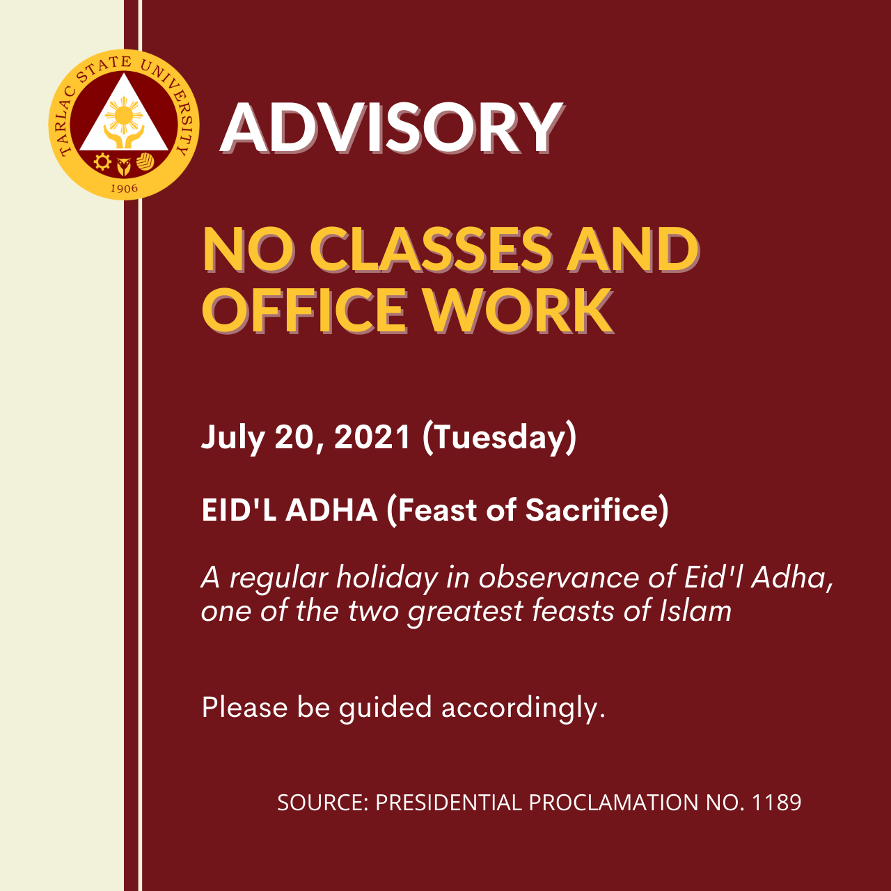 There will be no classes and office work on July 20, 2021 in observance of the Eid'l Adha or the Feast of Sacrifice as per Presidential Proclamation No. 1189.