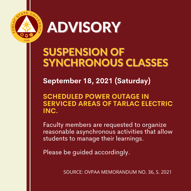 Online synchronous classes and activities are suspended on Saturday, September 18, 2021 due to the scheduled power outage in serviced areas of Tarlac Electric Incorporated.