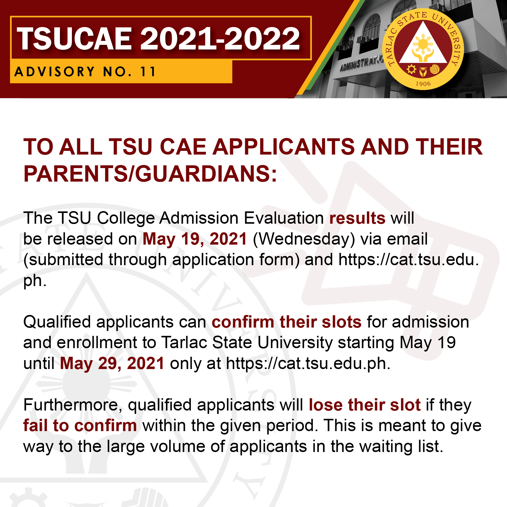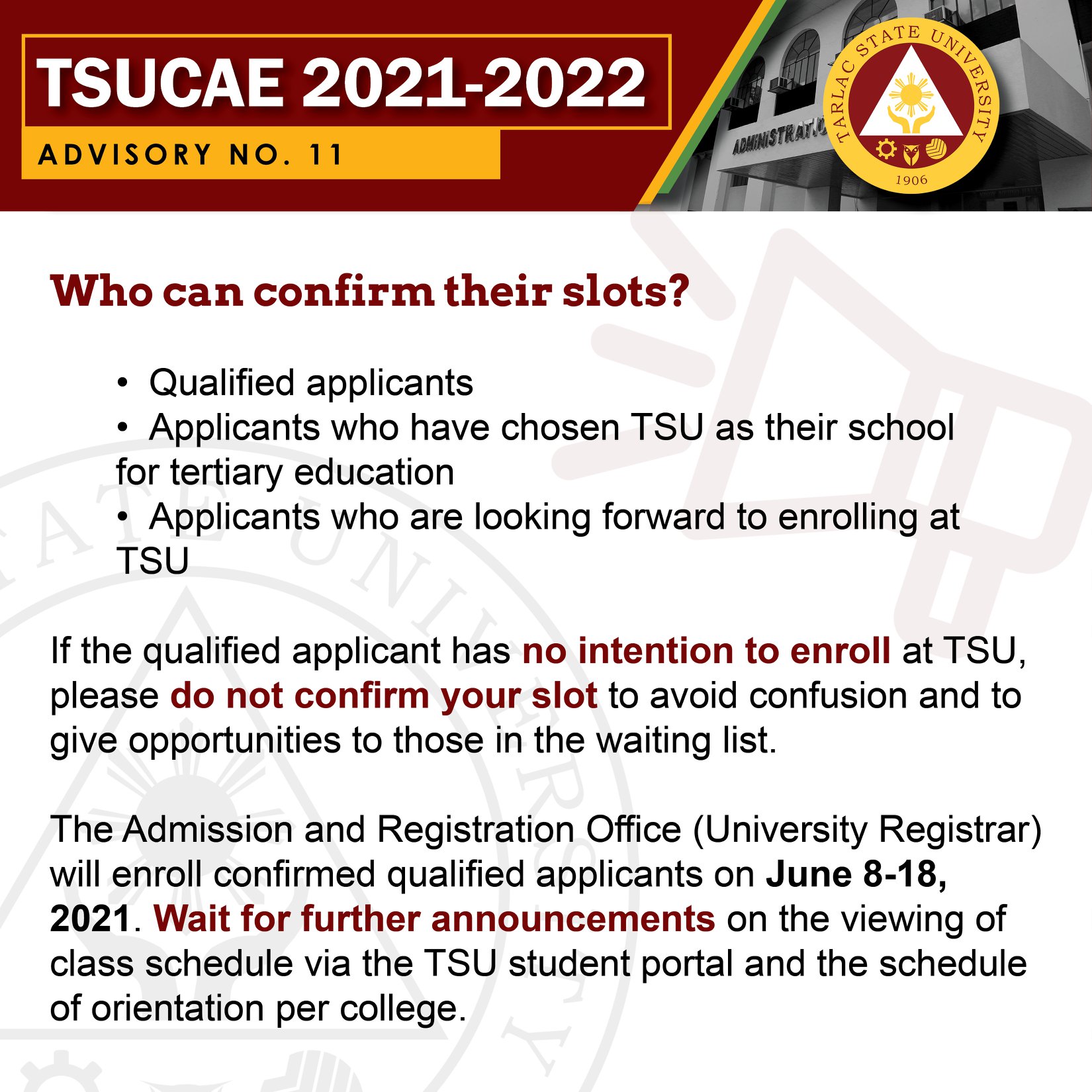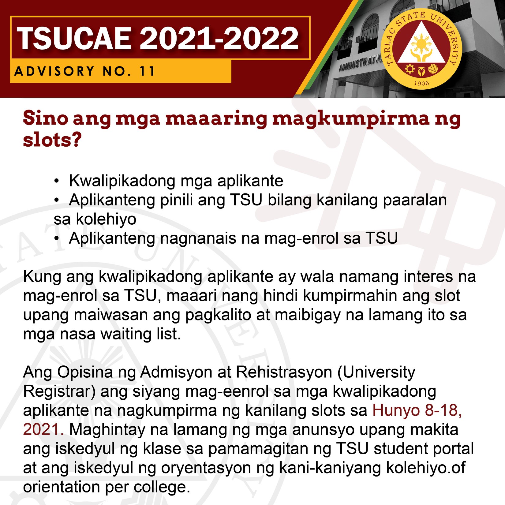 Ang mga kwalipikadong aplikante ay kinakailangang kumpirmahin ang kanilang slots para sa pagpapatala at pag-eenrol sa Tarlac State University simula Mayo 19 hanggang Mayo 29, 2021 lamang sa https://cat.tsu.edu.ph.