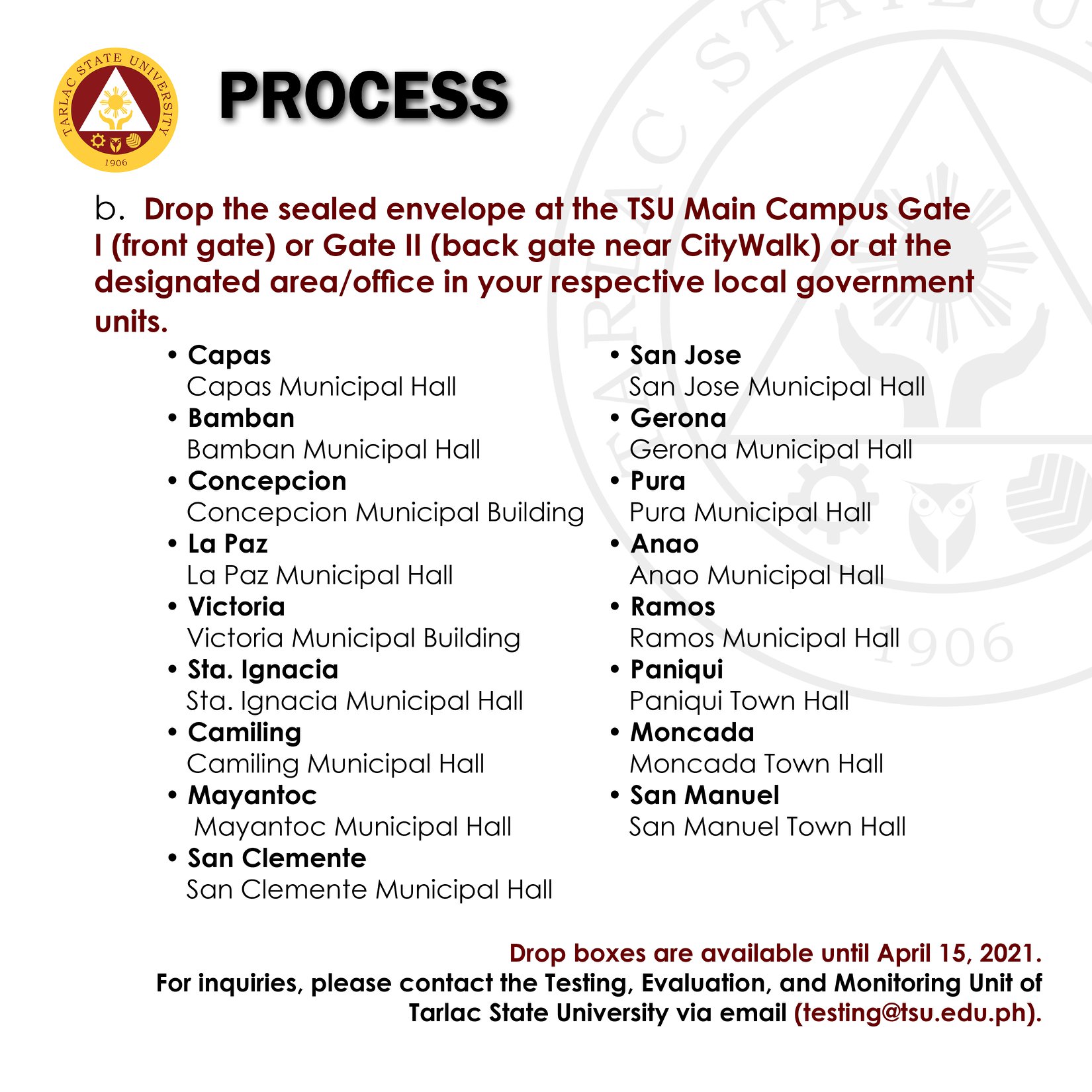 B. Drop the sealed envelope at the 𝗧𝗦𝗨 𝗠𝗮𝗶𝗻 𝗖𝗮𝗺𝗽𝘂𝘀 𝗚𝗮𝘁𝗲 𝗜 (𝗳𝗿𝗼𝗻𝘁 𝗴𝗮𝘁𝗲) 𝗼𝗿 𝗚𝗮𝘁𝗲 𝗜𝗜 (𝗯𝗮𝗰𝗸 𝗴𝗮𝘁𝗲 𝗻𝗲𝗮𝗿 𝗖𝗶𝘁𝘆𝗪𝗮𝗹𝗸) or at the designated area/office in your𝗿𝗲𝘀𝗽𝗲𝗰𝘁𝗶𝘃𝗲 𝗹𝗼𝗰𝗮𝗹 𝗴𝗼𝘃𝗲𝗿𝗻𝗺𝗲𝗻𝘁 𝘂𝗻𝗶𝘁𝘀.