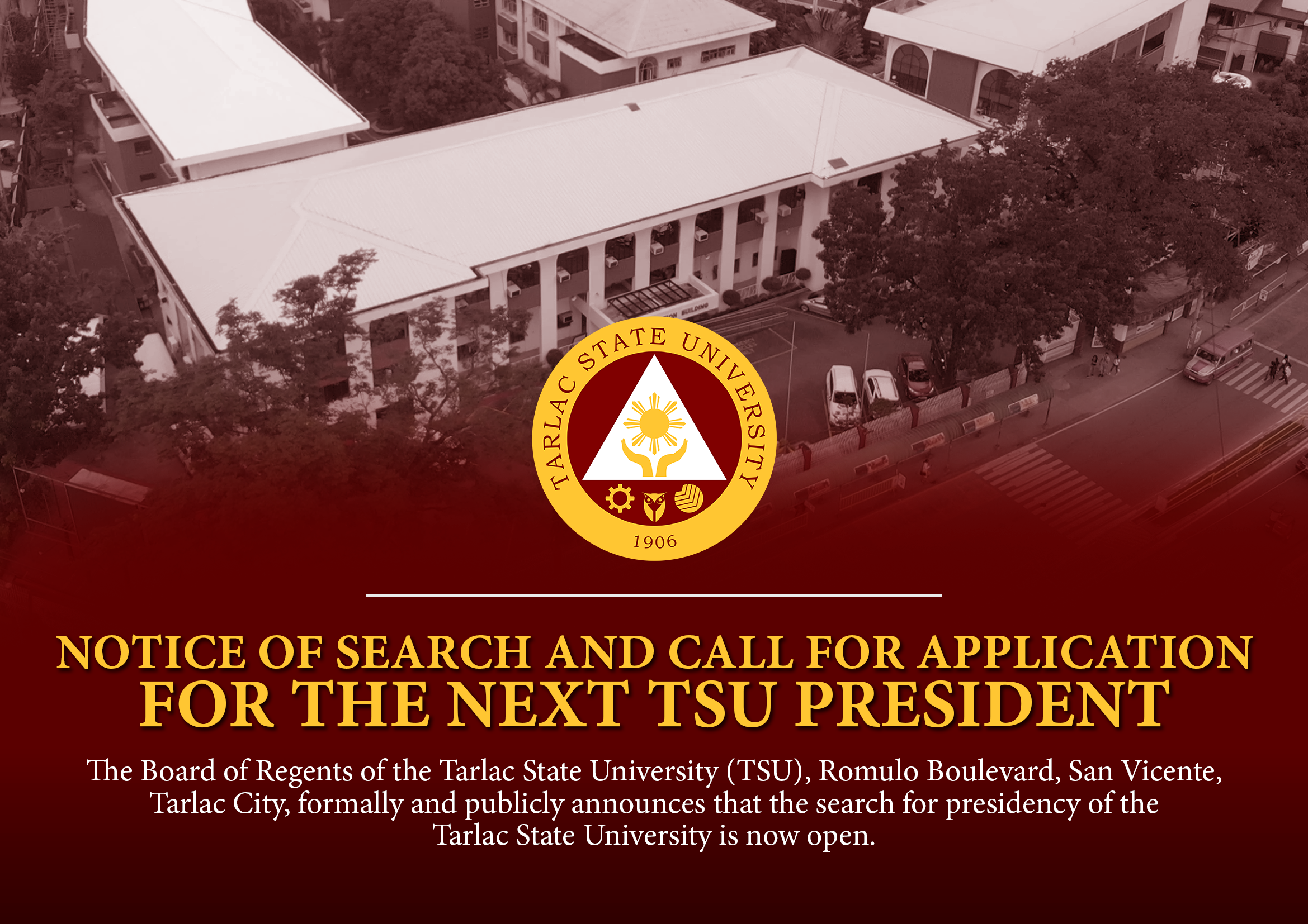 In view of the end of term of the incumbent President of the Tarlac State University on March 31, 2022, and in accordance with the provisions of Republic Act 8292, the Board of Regents of the Tarlac State University (TSU), Romulo Boulevard, San Vicente, Tarlac City, formally and publicly announces that the SEARCH FOR PRESIDENCY OF THE TARLAC STATE UNIVERSITY (TSU) is NOW OPEN.