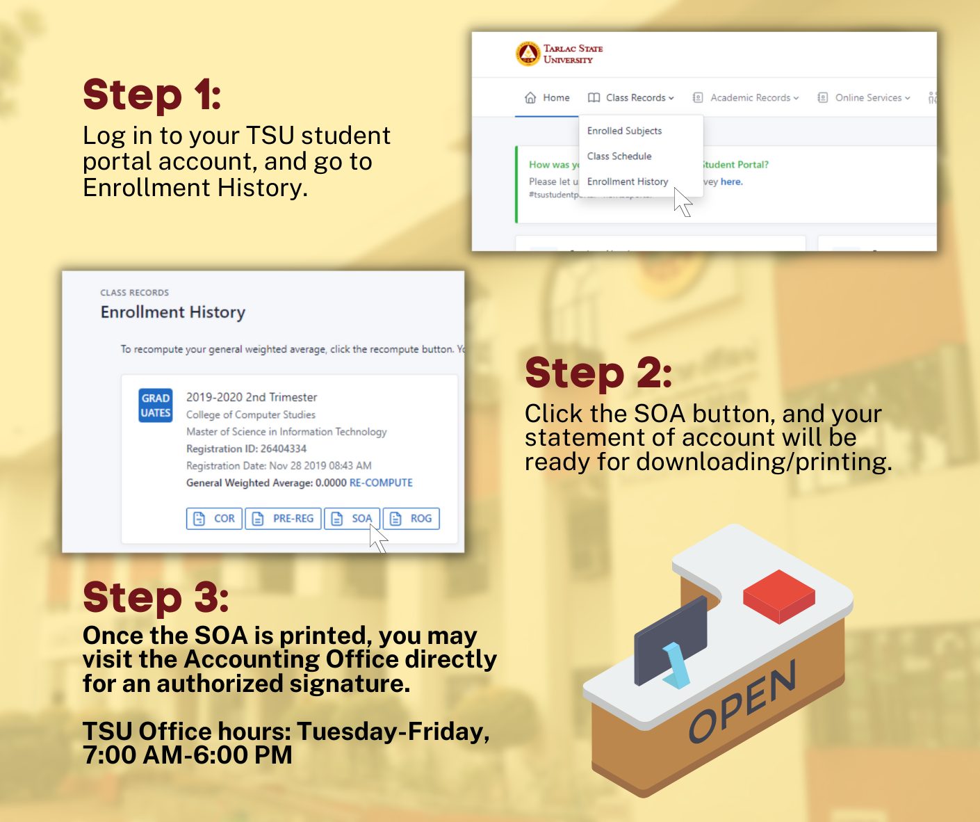 To all TSUians who are requesting a statement of account (SOA), you may now download it through your TSU student portal account. Click here for the steps on how to download your statement of account.