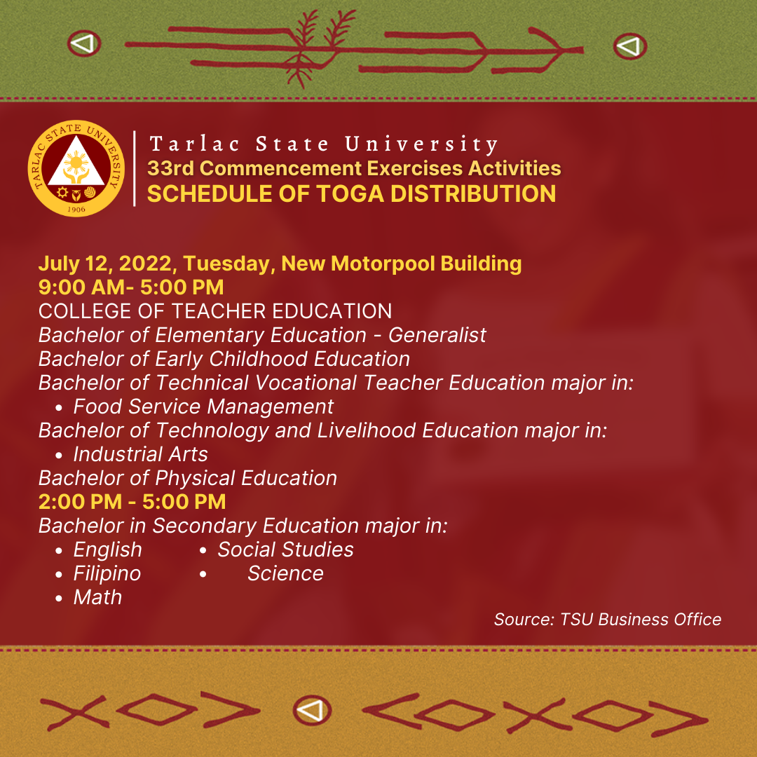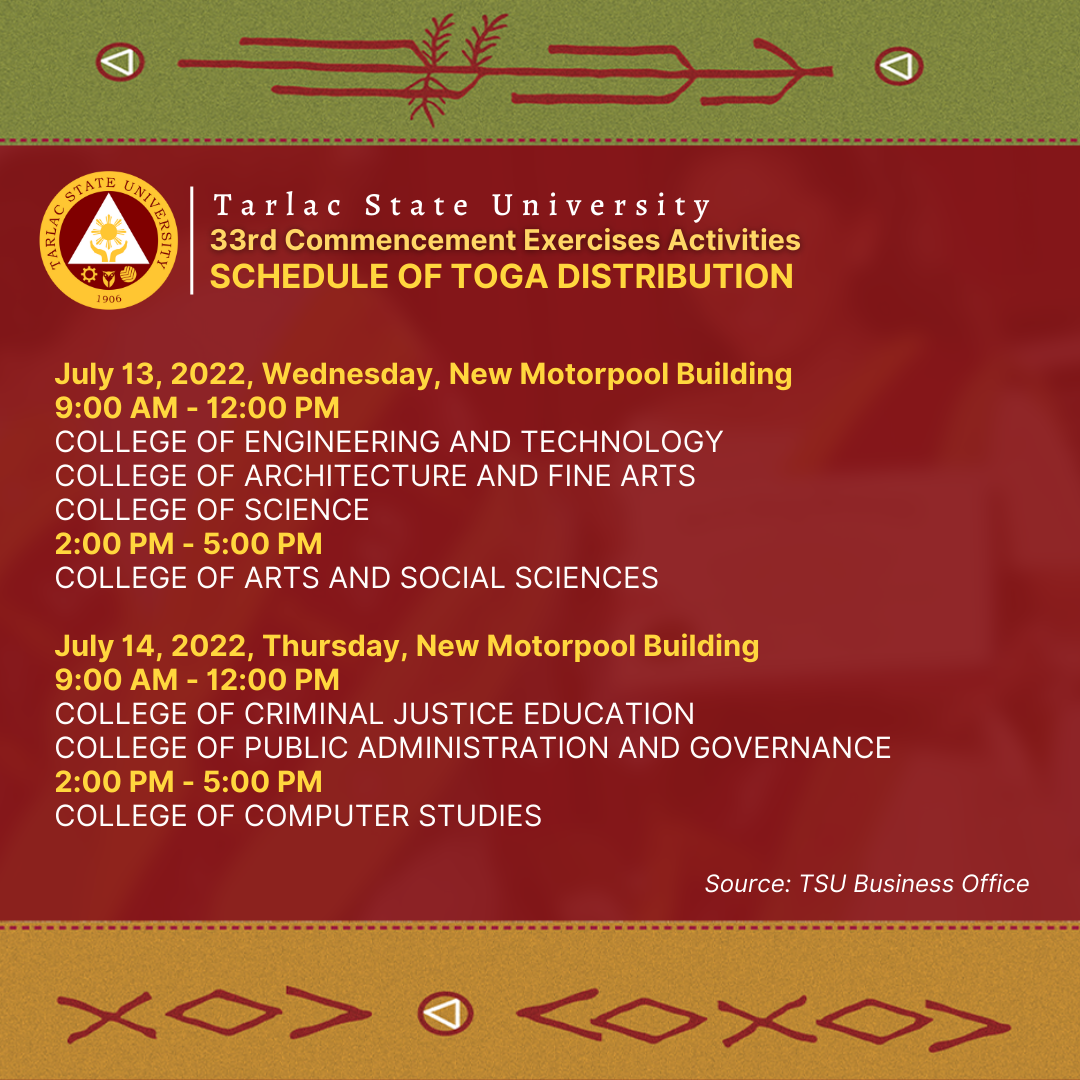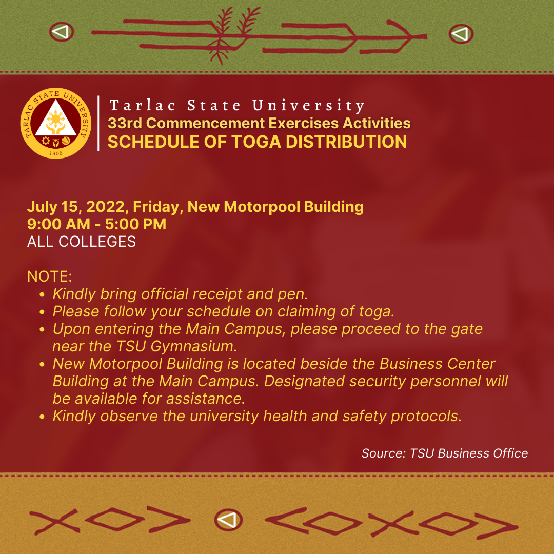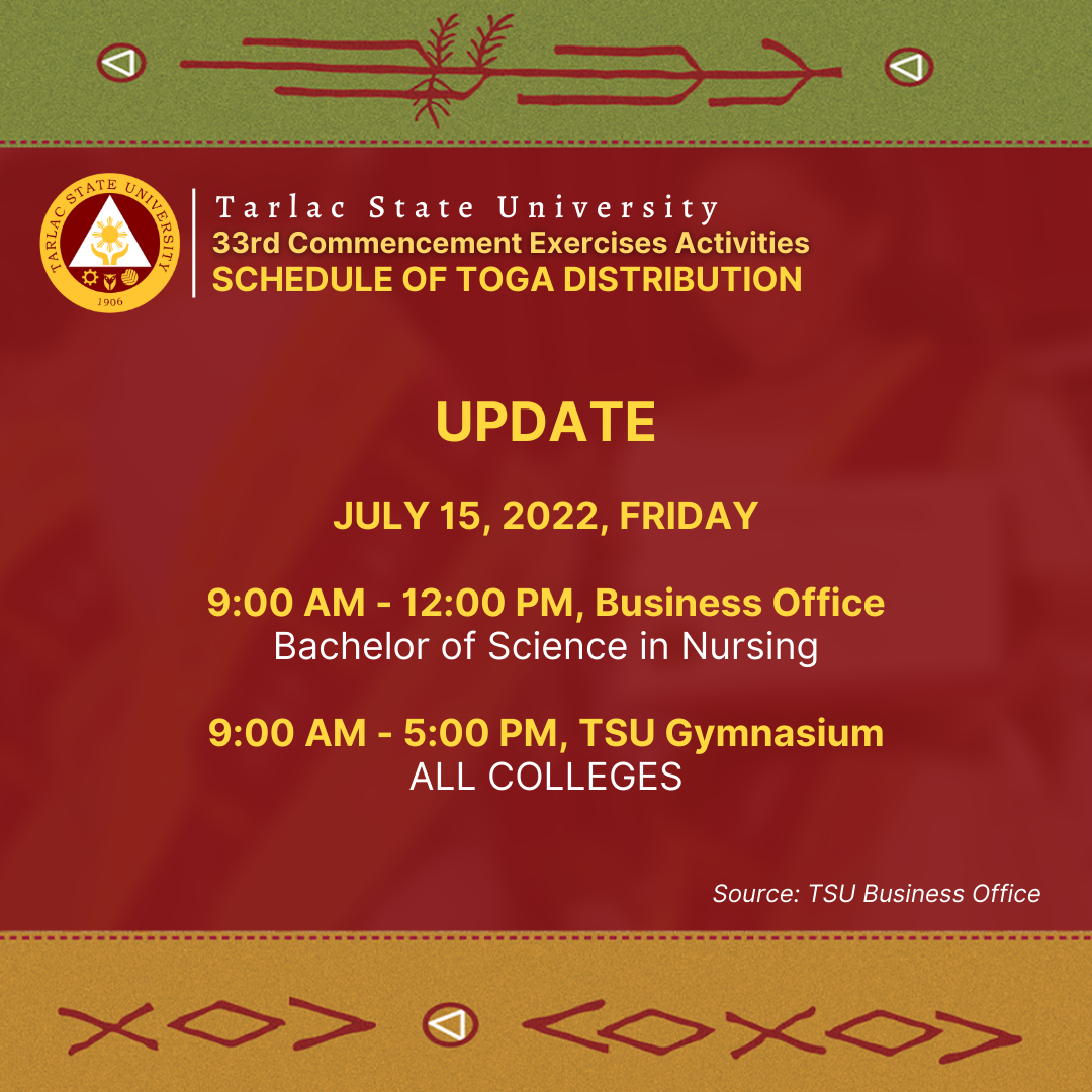To all candidates for graduation in the 33rd Commencement Exercises in July 2022 (undergraduate programs), please see the following schedule of toga distribution from July 11 to July 15, 2022.