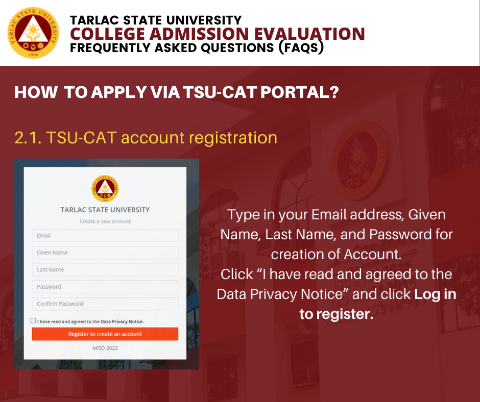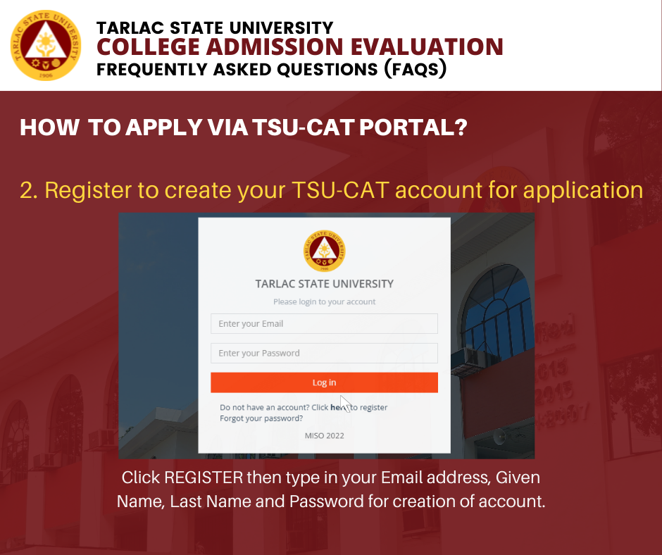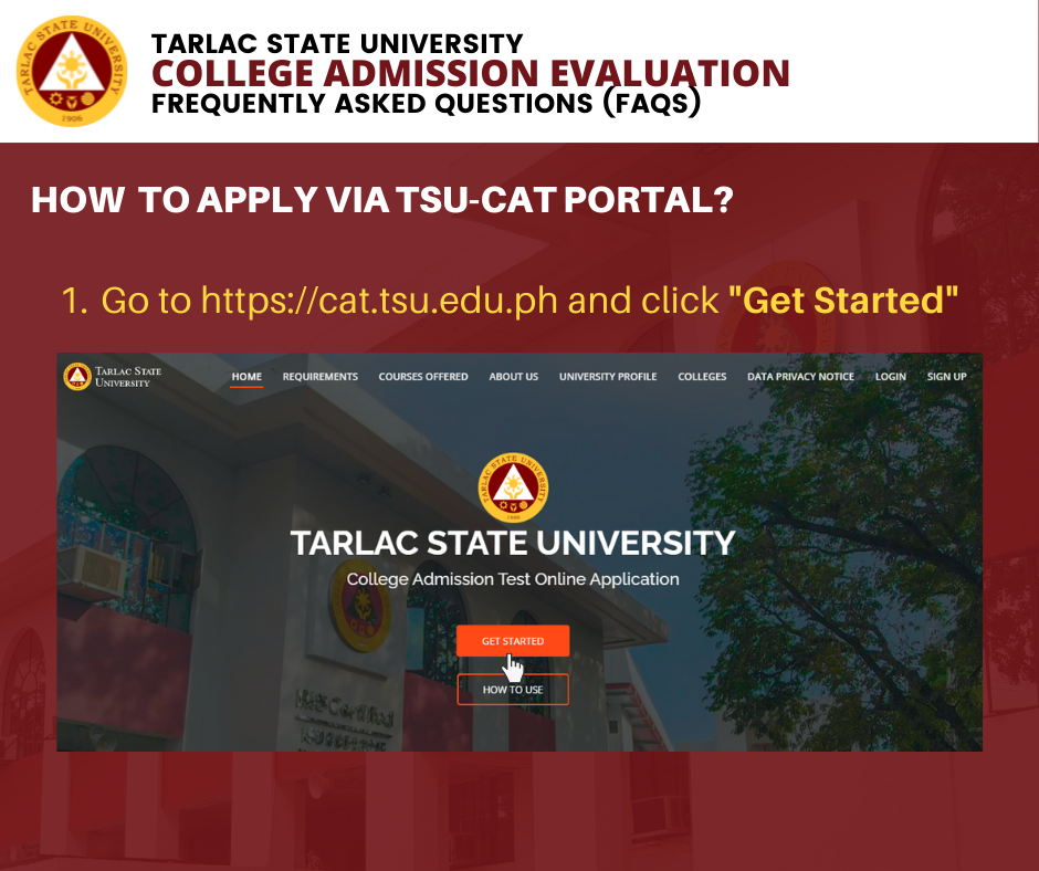 Go to https://cat.tsu.edu.ph, click GET STARTED, and log in to your TSU CAT account or click REGISTER to create an account.