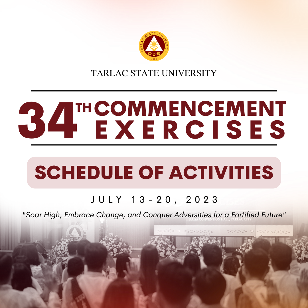 To all candidates for graduation of the 34th Commencement Exercises this July 2023, the Tarlac State University will conduct face-to-face graduation ceremonies on July 13, 14, and 17-20, 2023.