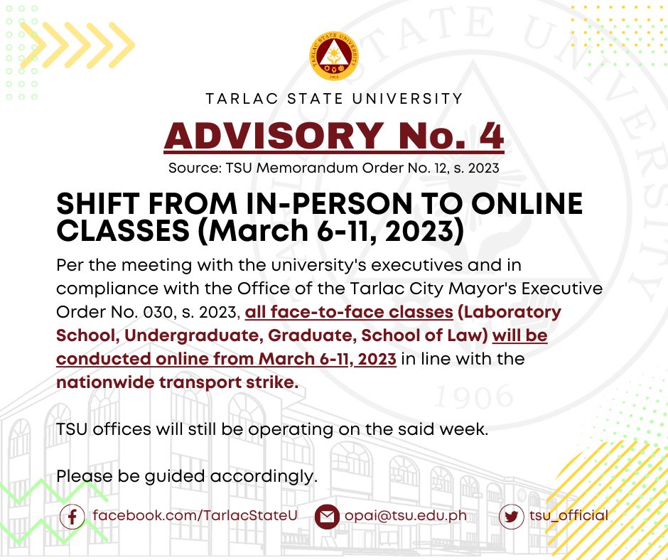 Per the meeting with the university's executives this afternoon and in compliance with Executive Order No 030, series of 2023 issued by the Office of the Tarlac City Mayor, all face-to-face classes (Laboratory School, Undergraduate, Graduate, and School of Law) will be conducted online from March 6 to 11, 2023 in line with the nationwide transport strike.