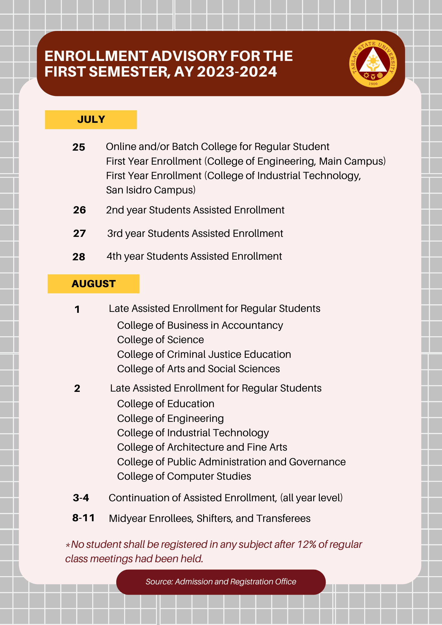 Specific enrollment schedules per program will be announced by your respective colleges.