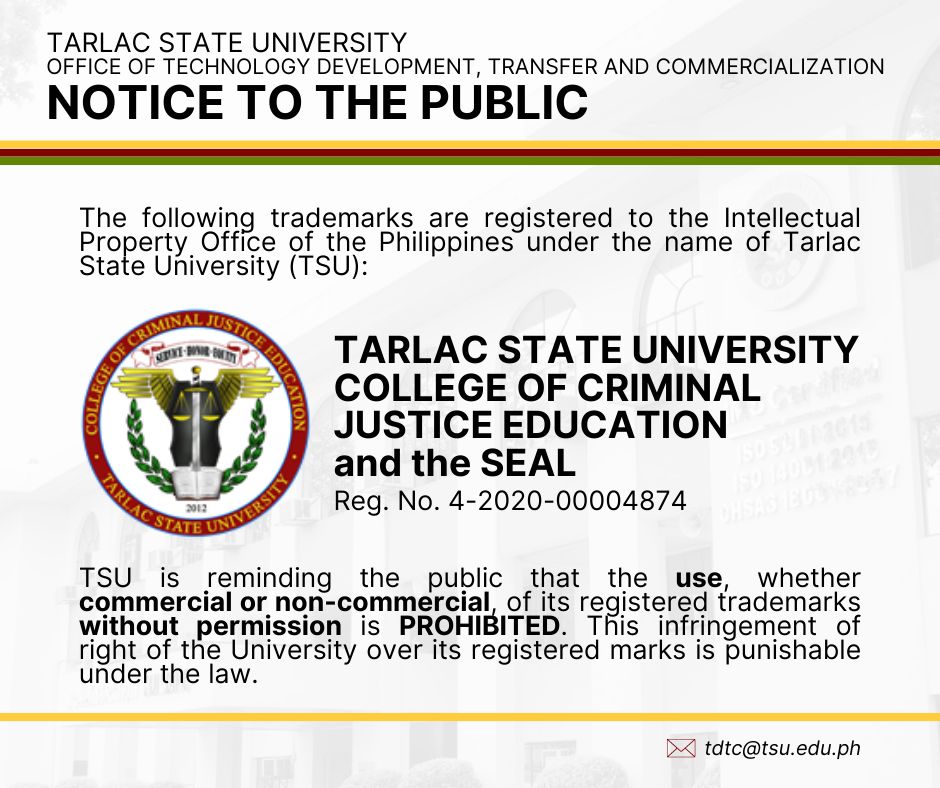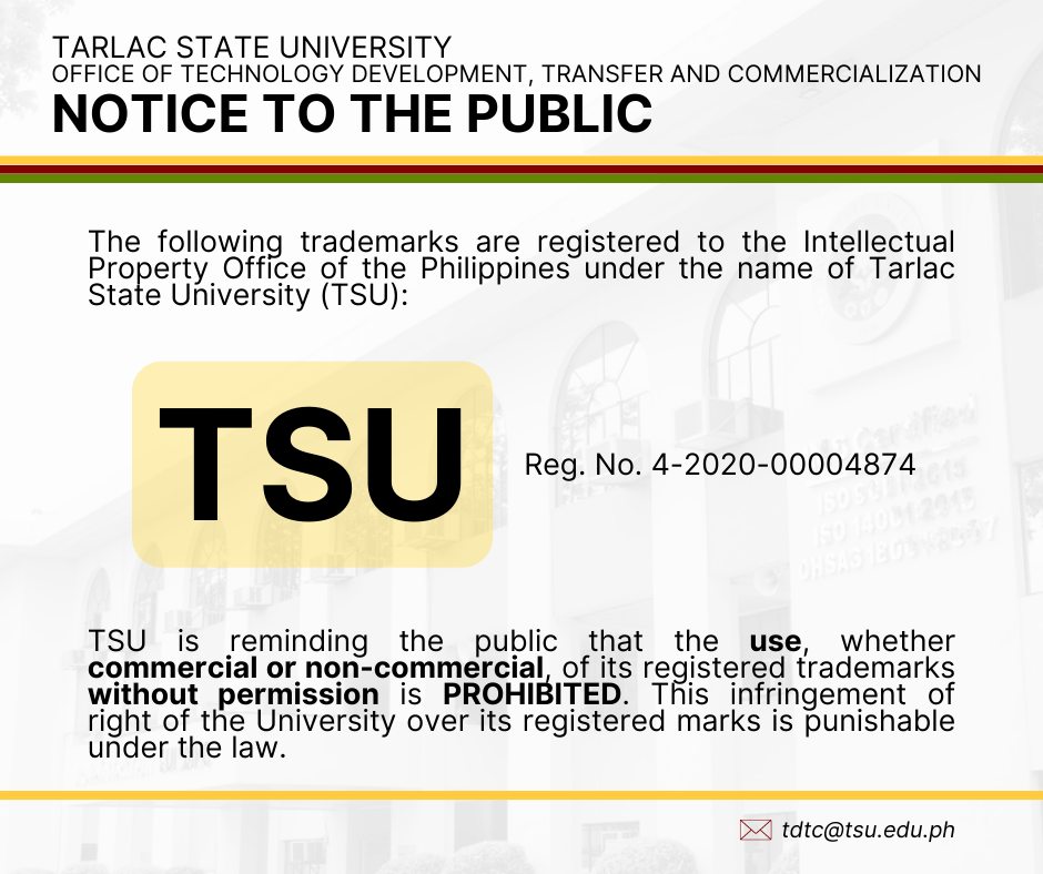The following trademarks are registered to the Intellectual Property Office of the Philippines under the name of TARLAC STATE UNIVERSITY (TSU)