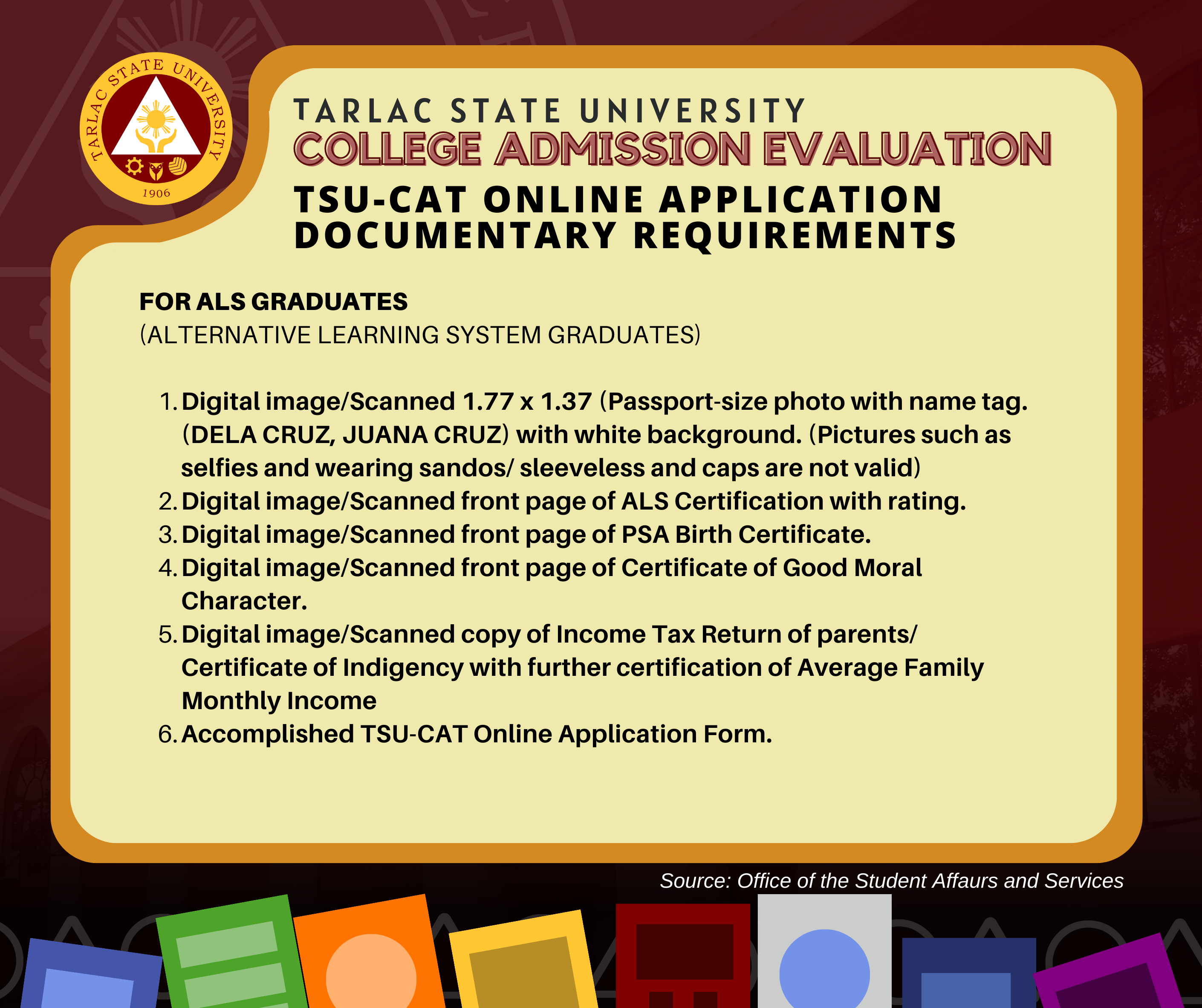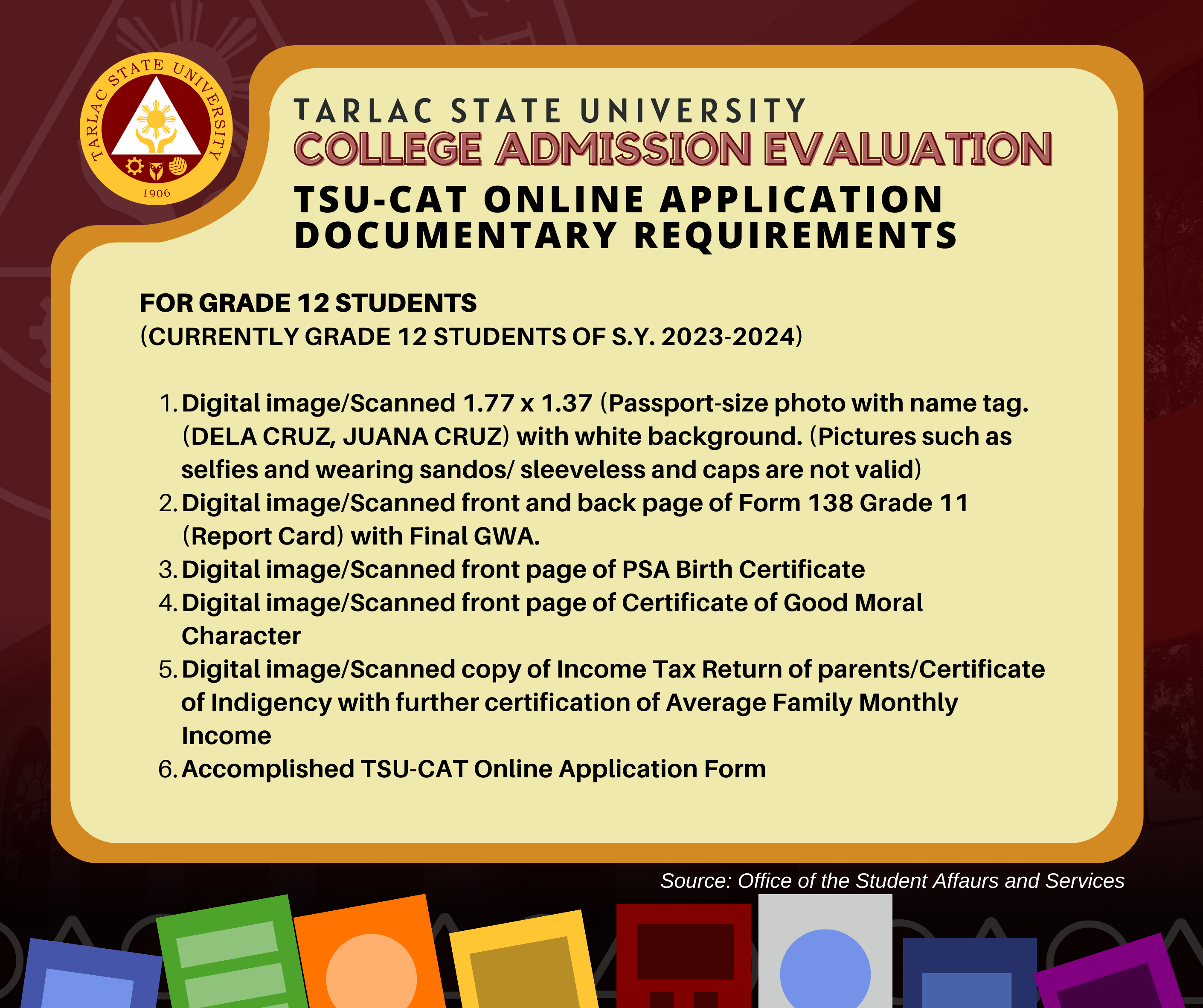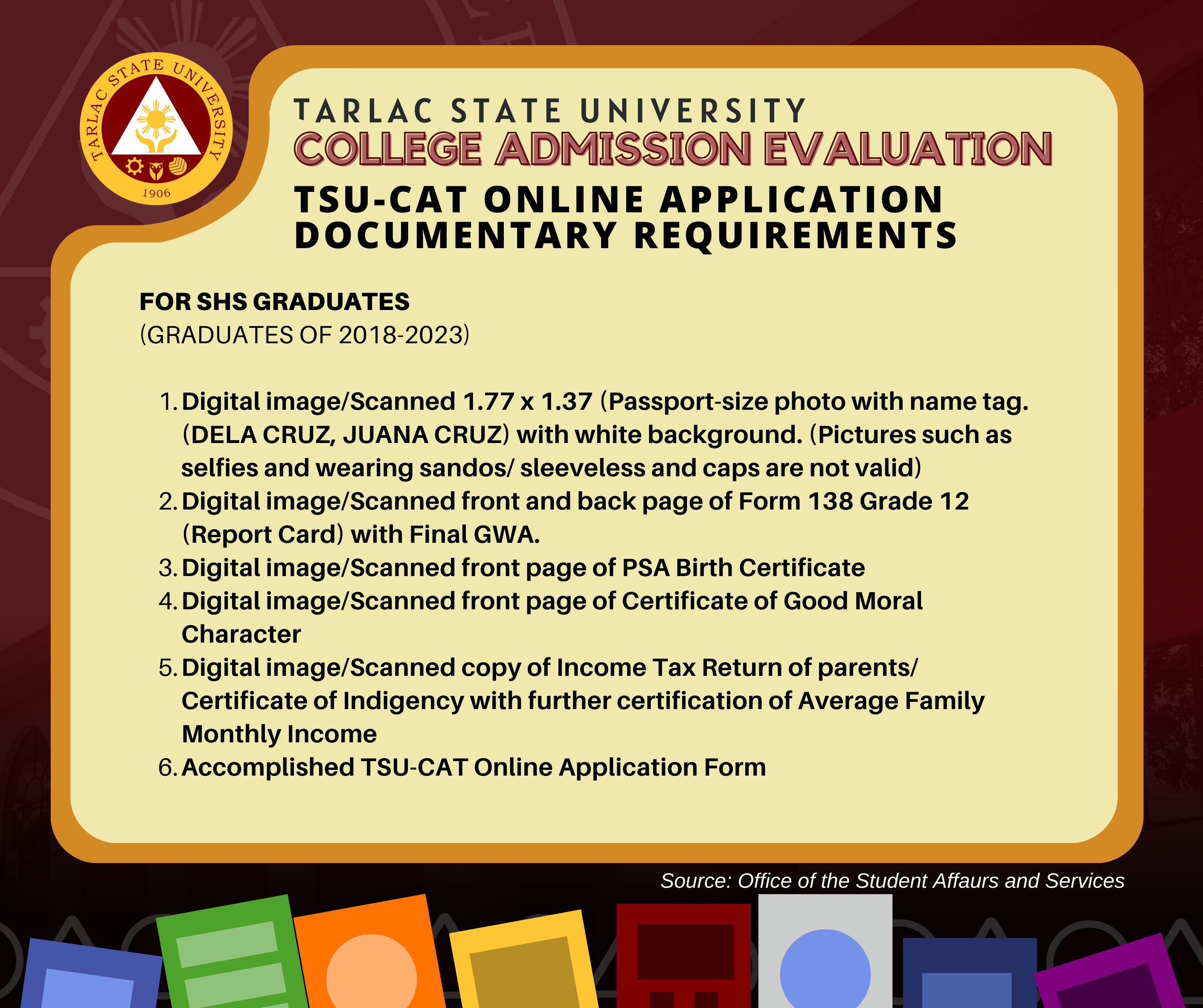 Application and uploading of requirements will only be online via https://cat.tsu.edu.ph every Monday to Friday from 7:00 AM to 6:00 PM.