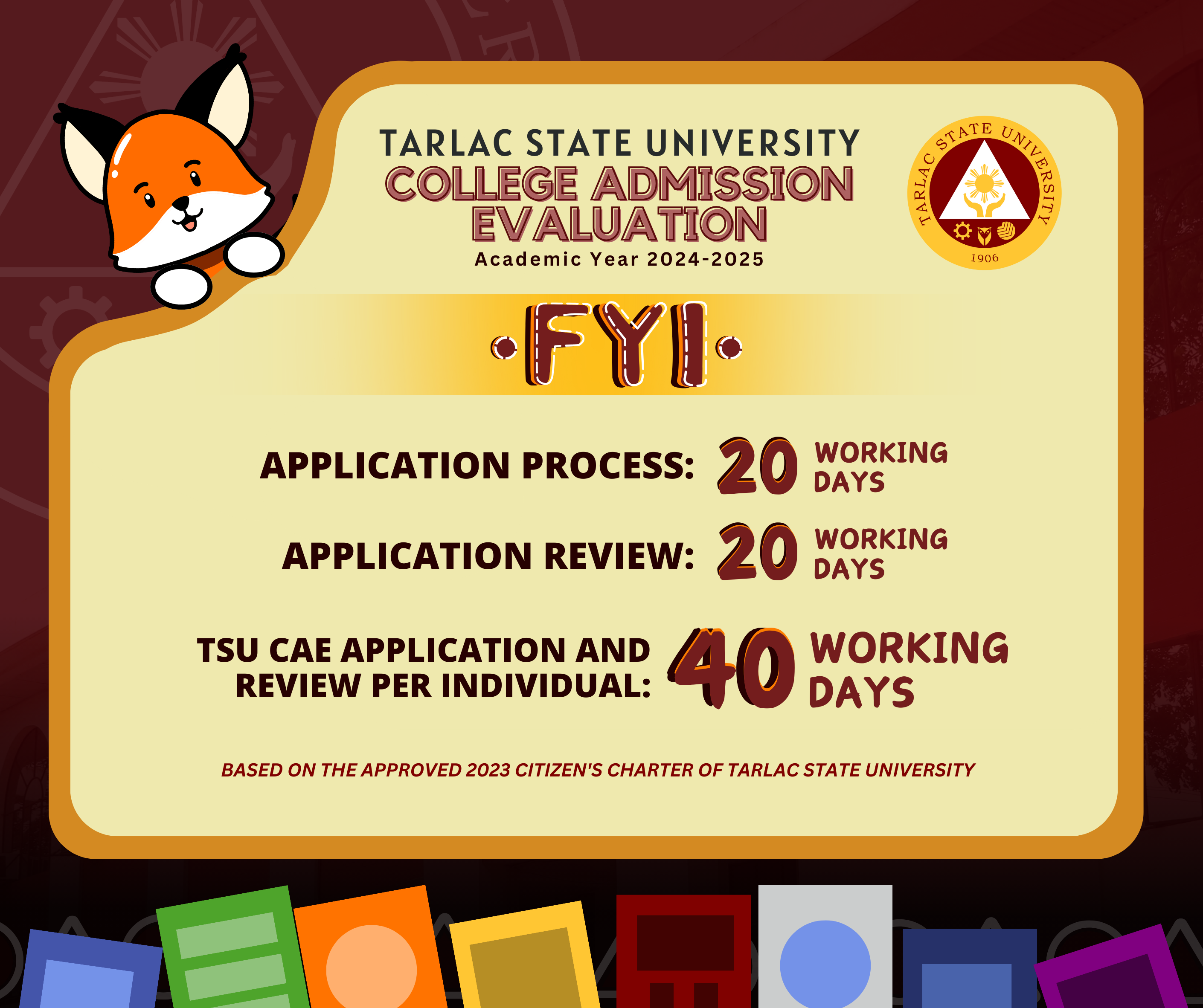 This is based on the approved 2023 Citizen's Charter of Tarlac State University (see pp. 359-360