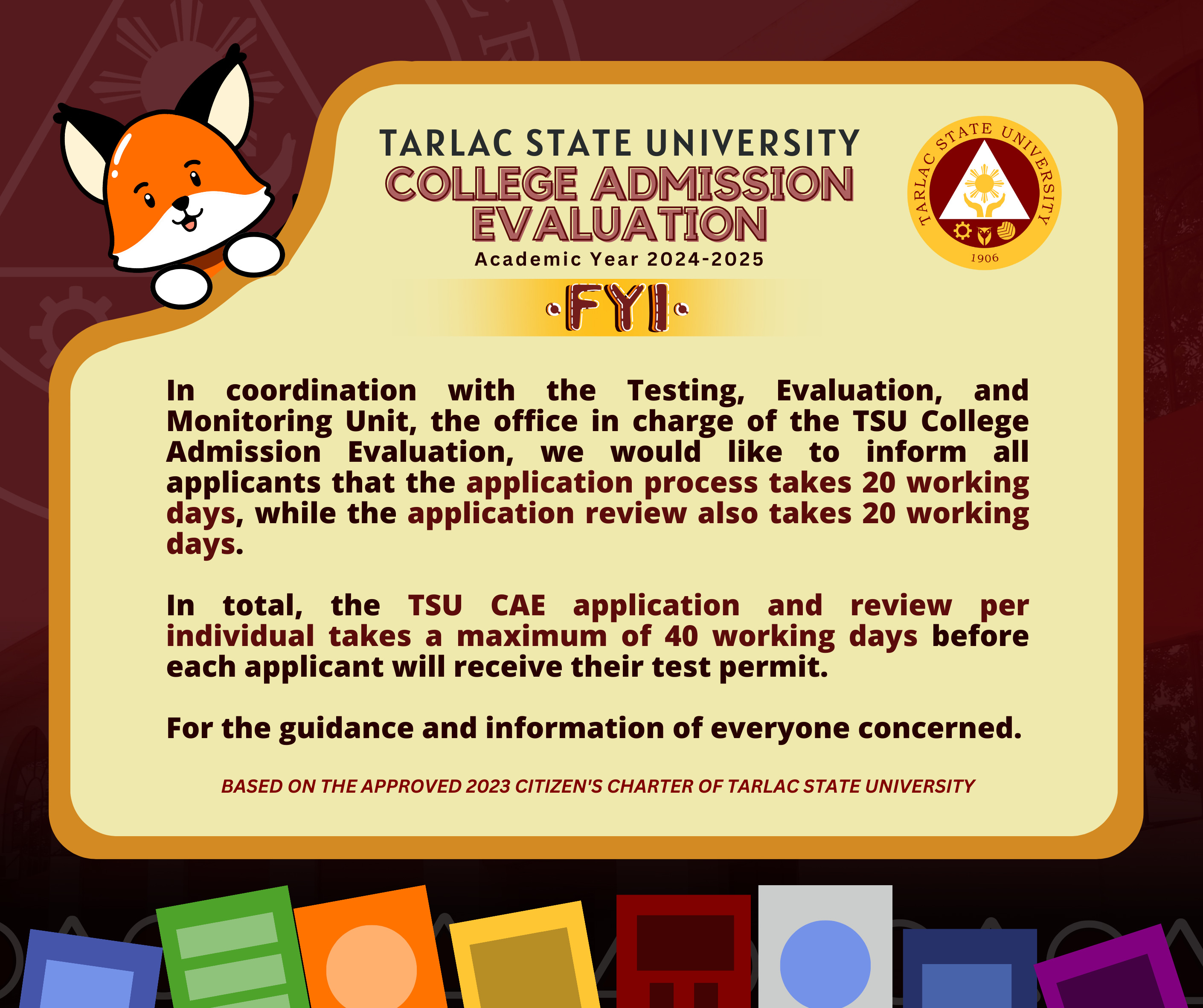 In coordination with the Testing, Evaluation, and Monitoring Unit, the office in charge of the TSU College Admission Evaluation, we would like to inform all applicants that the application process takes 20 working days, while the application review also takes 20 working days.
