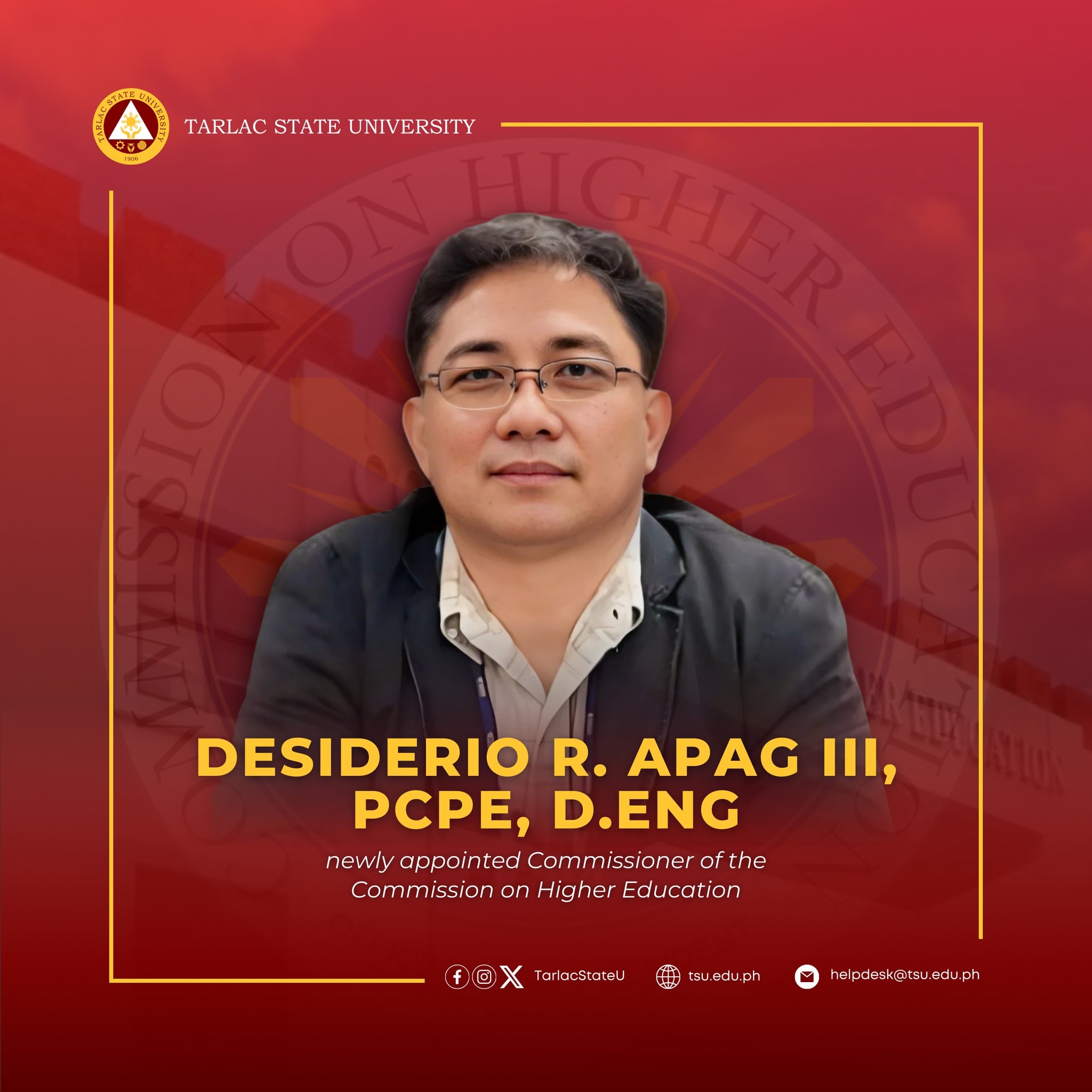 Tarlac State University sends its warmest congratulations to Dr. Desiderio Rana Apag III on his appointment as Commissioner of the Commission on Higher Education.