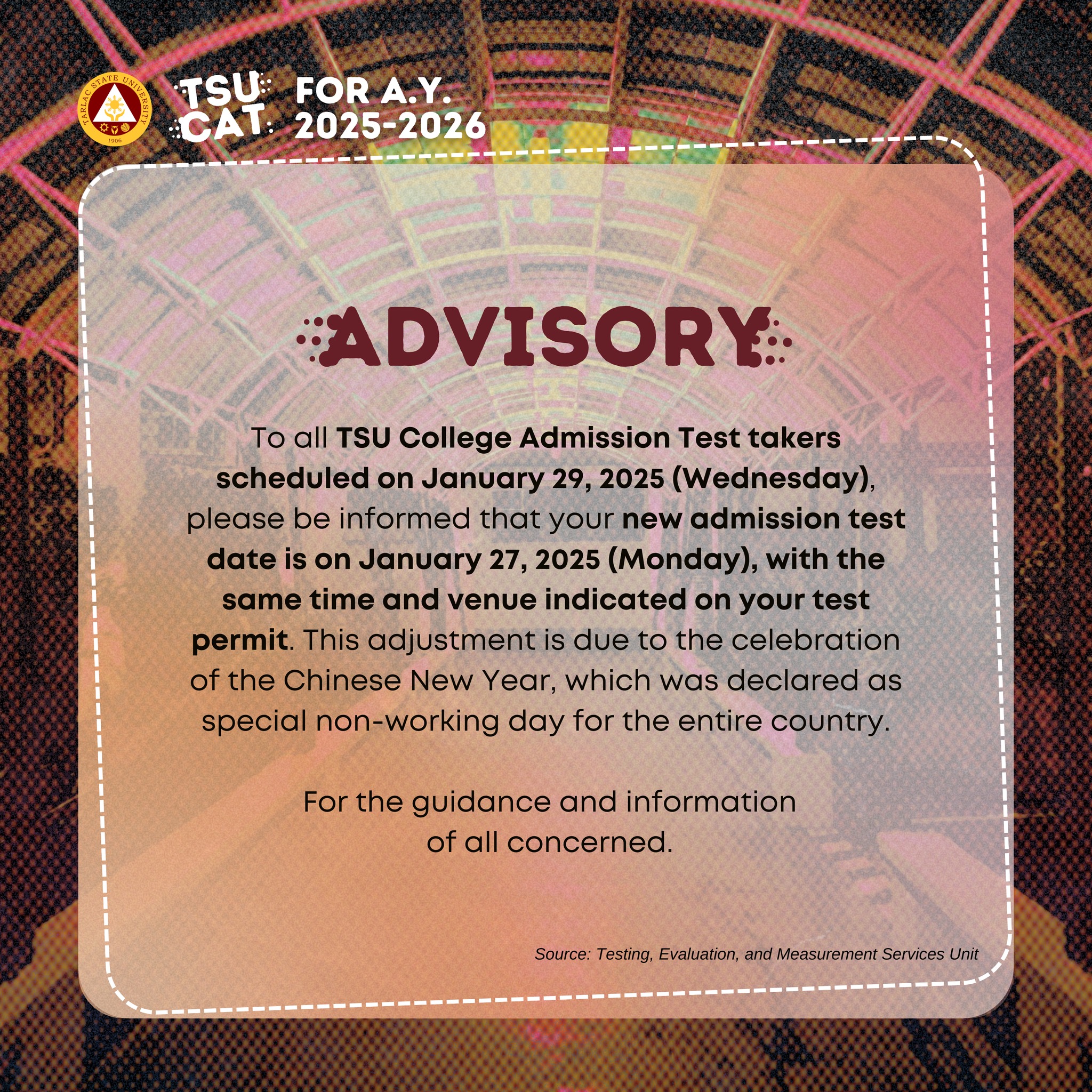 To all TSU College Admission Test takers scheduled on January 29, 2025 (Wednesday), please be informed that your new admission test date is on January 27, 2025 (Monday), with the same time and venue indicated on your test permit. This adjustment is due to the celebration of the Chinese New Year which declared as special non-working day for the entire country.