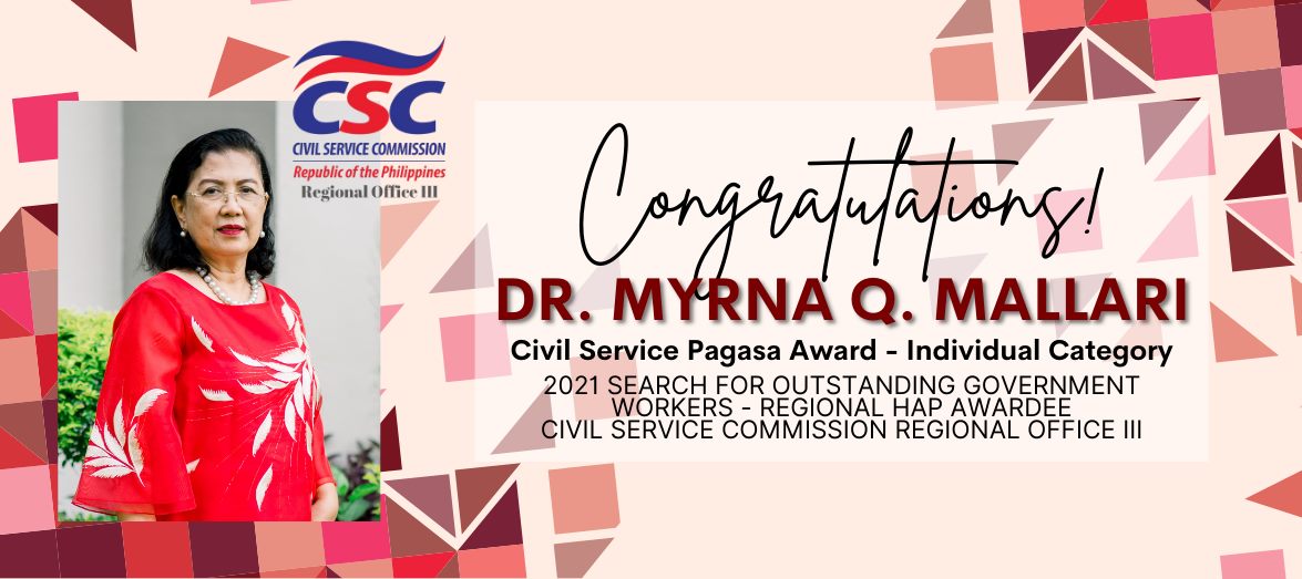 Tarlac State University President Dr. Myrna Q. Mallari was listed among the awardees of the Civil Service Commission Pagasa Award yesterday, September 30, in a video uploaded by the CSC Regional Office 3 on Facebook as part of its concluding activities for the 121st Philippine Civil Service Anniversary.