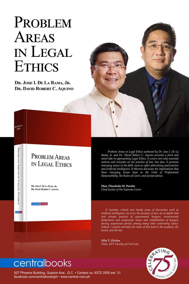 "Problem Areas in Legal Ethics presents a novel take in approaching Legal Ethics. Not only does it cover essential notions and concepts on the practice of law, it also presents emerging issues in the legal field, such as cyber advertising and practice and artificial intelligence,” CJ Peralta said in his foreword.