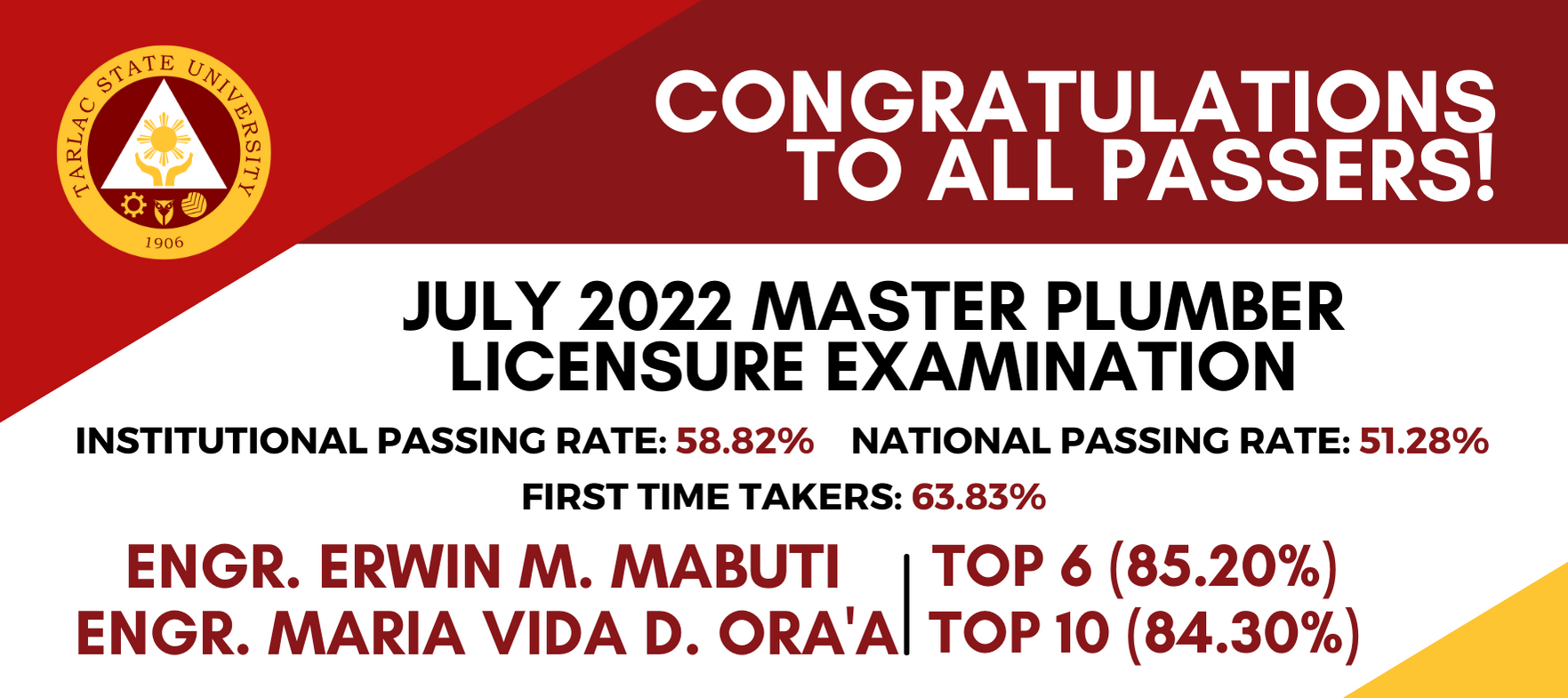 Engineers Erwin M. Mabuti and Maria Vida D. Ora'a, Tarlac State University's civil engineering alumni, are among the topnotchers in the July 2022 Master Plumber Licensure Examination per the results released earlier tonight (July 25) by the Professional Regulation Commission (PRC).