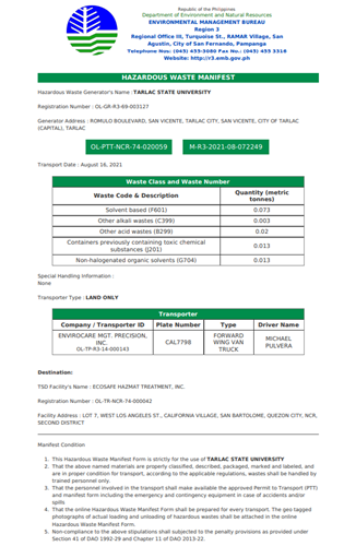 According to RA 6969 “Toxic Substances and Hazardous and Nuclear Wastes Control Act of 1990” states that every establishment must disposed all hazardous wastes. To continually protect and preserve the environment the university Pollution Control and Safety Unit consistently monitors and assist the disposal of all hazardous chemicals in the university that can harm the environment.